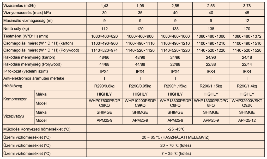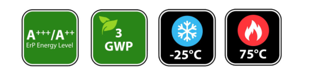 - A legújabb R290 hűtőközeggel működnek, és 75c° előremenő vizet képesek előállítani.